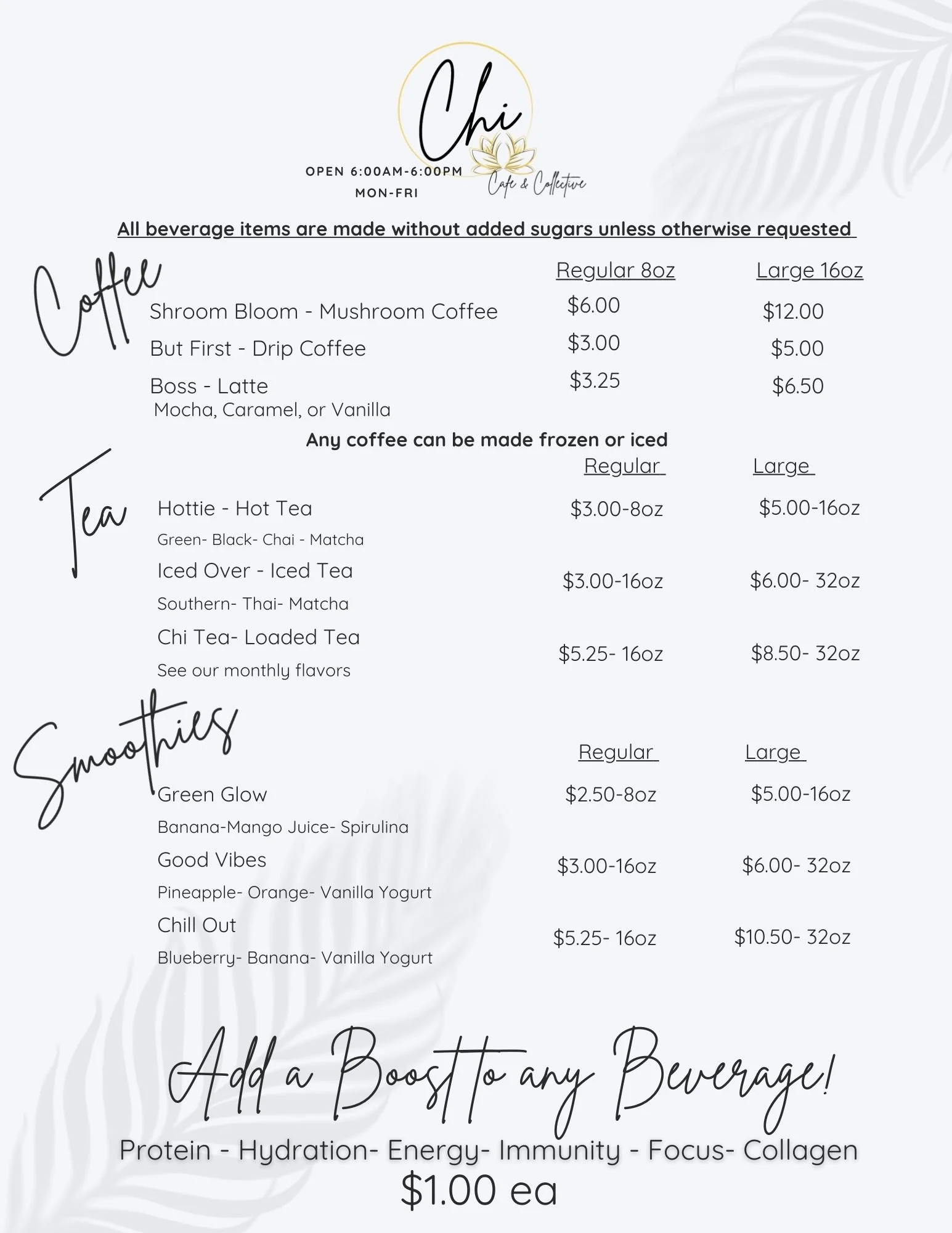 At Chi Café & Collective, our mission is to cultivate connection and renewal. We provide a peaceful place where parents and community members can gather, share ideas, support one another, and find a moment of calm through nourishing drinks, wholesome food, and meaningful conversation.